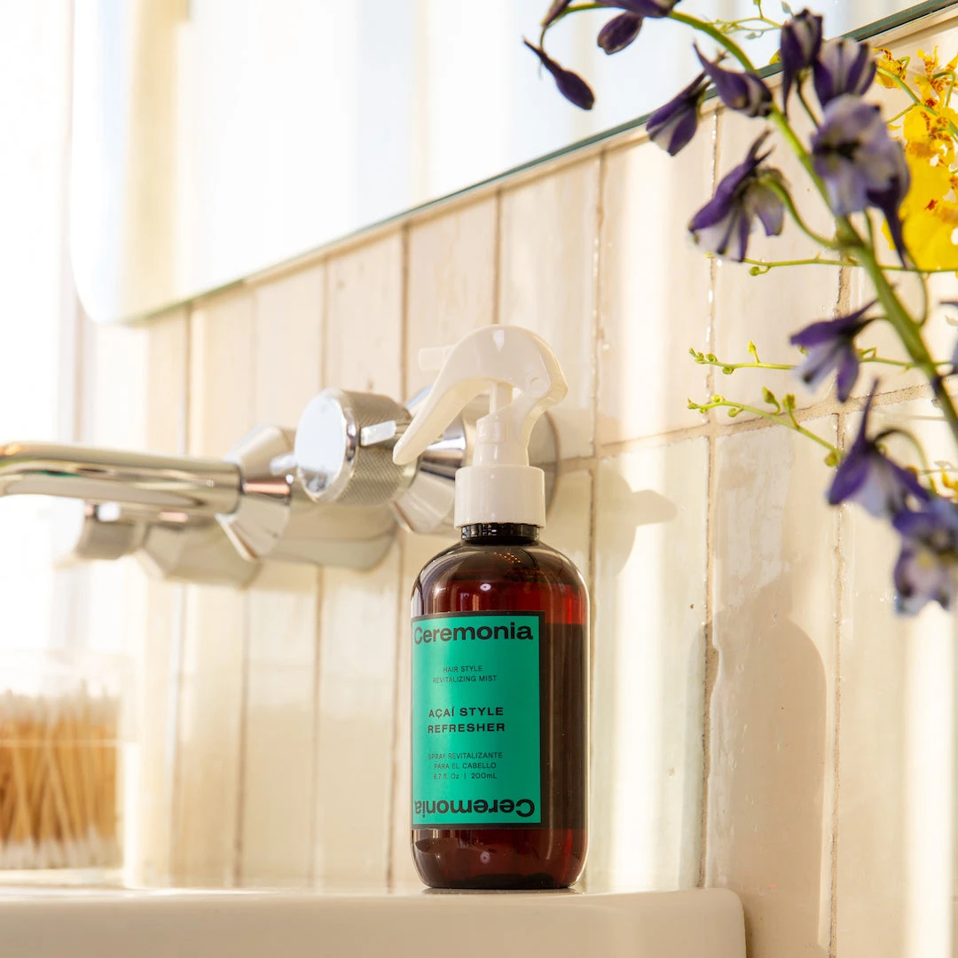 Product Description: The Açai Style Refresher is the essential pick-me-up for your hair anytime, anywhere. A water-based mist that’s one part fragrance, one part resculpting, infused with Ceremonia’s signature scent. This refreshing mist will bring life to those in-between wash days. Superfruit Açai’s powerful antioxidants create a versatile formula that restores flexibility with a subtle hold to reshape strands.