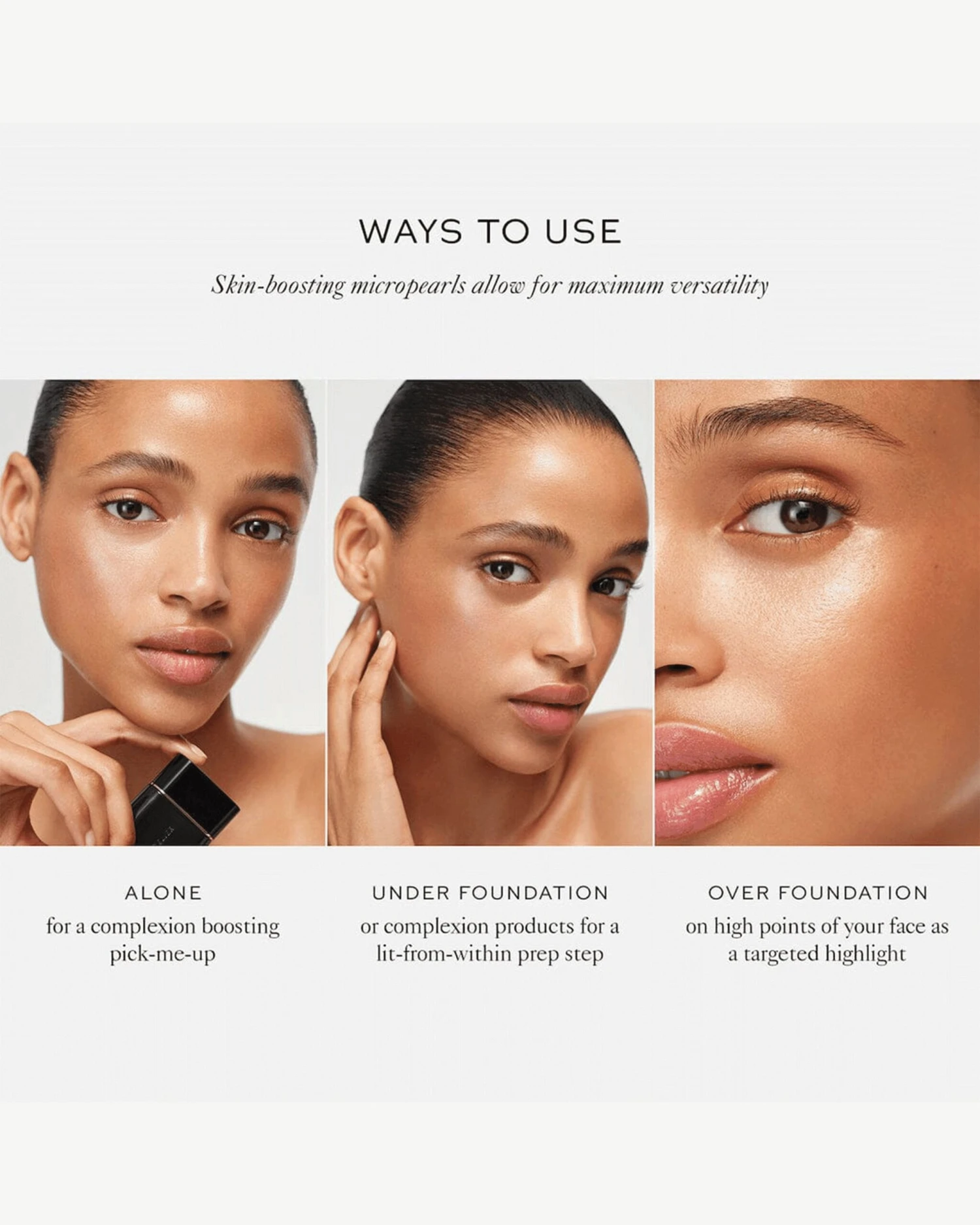 Why we love it: The quickest way to get compliments on your skin. This lightweight sheer complexion enhancer adds life to your skin in an instant. Multidimensional pearls reflect light for a “you-look-well” glow— while letting true skin show through for a uniquely real finish. A concentrated blend of Vitamin C, antioxidants, and nourishing oils retexturize, even tone, and brighten skin over time. Wear on its own, layer under foundation, or tap onto the high points for a quick touch-up. Available in three perfect tones.
