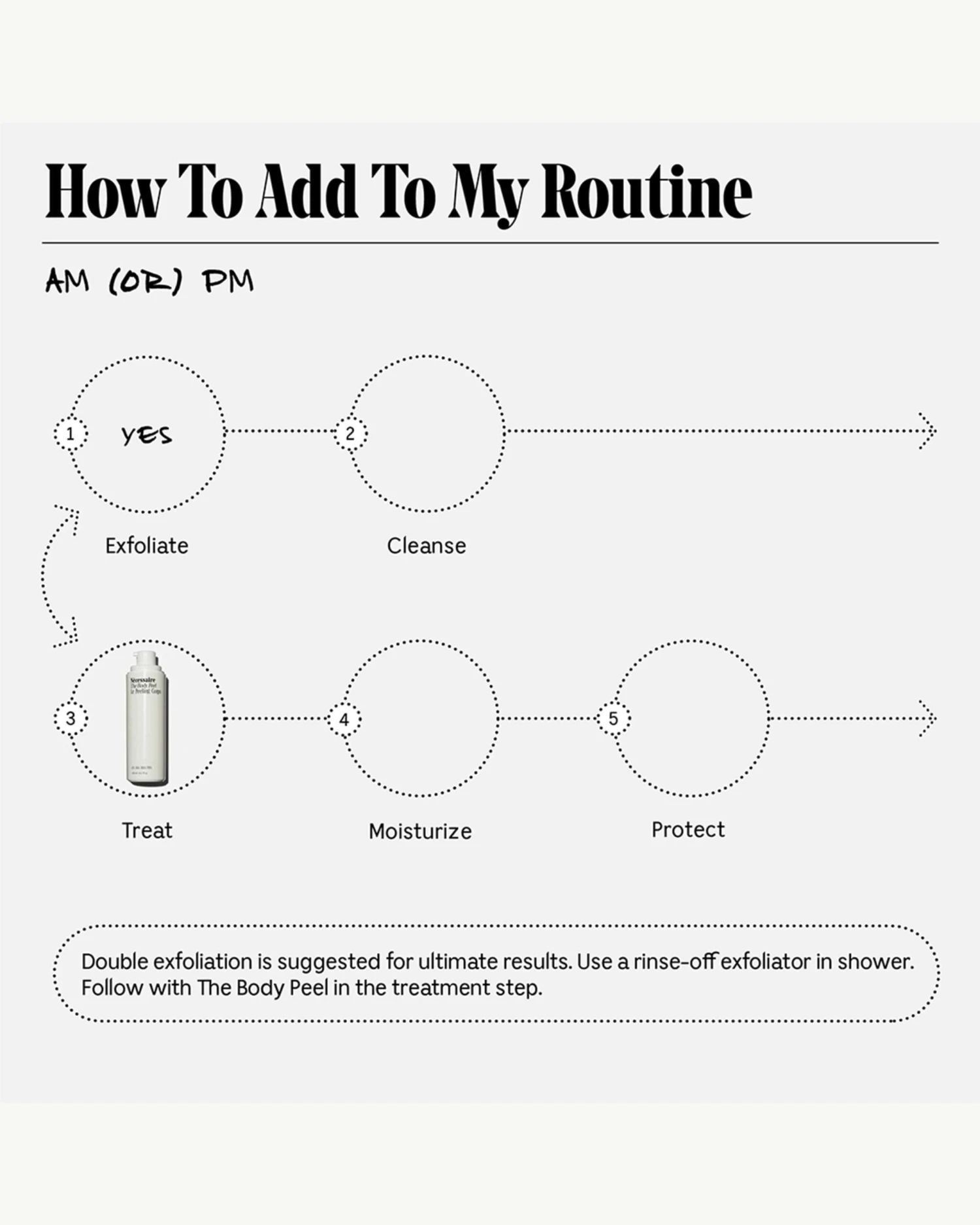 Skincare For The Body. A daily acid peel with 12% AHA/BHA/PHA ,1% Reserveratrol + Peeling Peptide to erase common texture and tone concerns. Helps treat and prevent KP, ingrowns, strawberry skin and discoloration for smoother skin. Leave-on. Dermatologist-Tested. Hypoallergenic. Non-Comeodegenic.